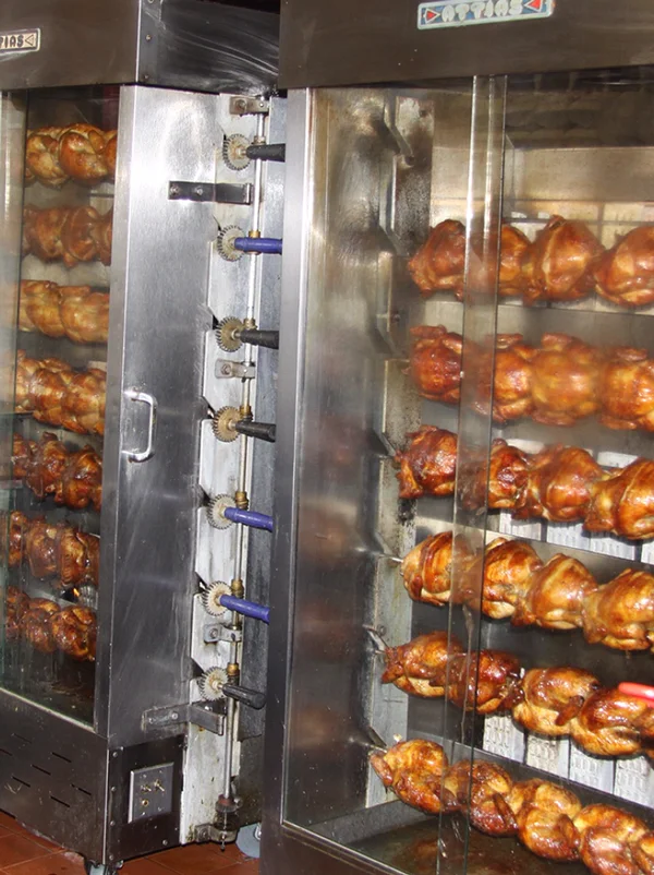 It is a rotisserie chicken dish that is a Peruvian version of Pollo al spiedo It was developed in Peru circa the 1960s by Roger Schuler and Franz Ulrich, who were Swiss residents in the country. Schuler was in the hotel business in Peru. He devised the specific method of cooking the chicken, observing his cook's technique in preparation, and gradually, along with his business partners, perfected the recipe, creating the Granja Azul restaurant in Santa Clara, district of Ate, in Lima.